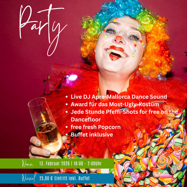 Ja, da wird es mal niveaulos bei uns. Apre-Shki-Musik, Shots, Buffet und mehr für 25 Euro von 18.00 bis 02.00Uhr. Nur mit Reservierung.
